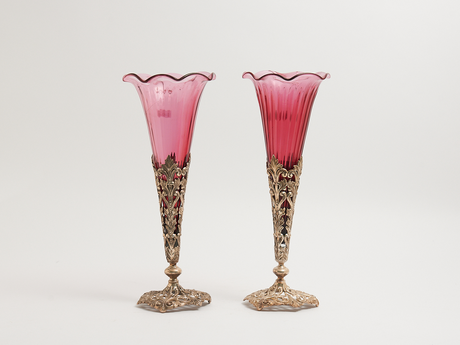 A PAIR OF LATE 19TH / EARLY 20TH CENTURY SILVER PLATE AND MOULDED CRANBERRY GLASS VASES (A/F THE GLASS OF EACH BROKEN AND REPAIRED) H.37CM, LEONARD JOEL LOCAL DELIVERY: MEDIUM