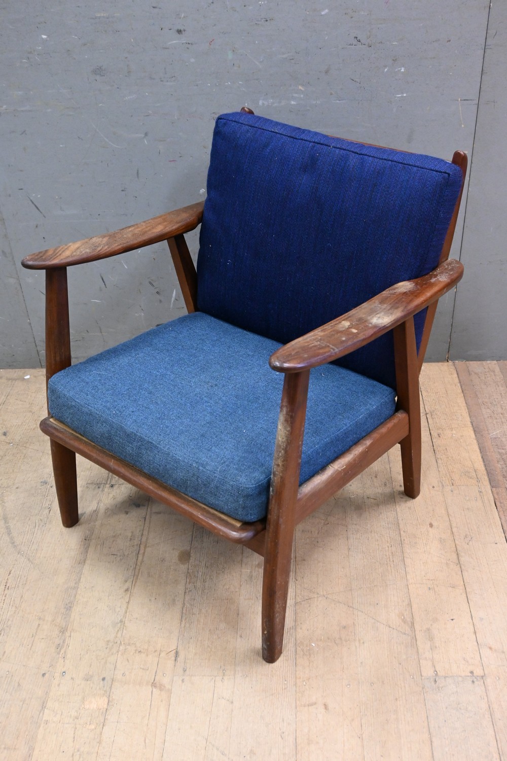 A MID-CENTURY STAINED TEAK ARMCHAIR (A/F) (73H X 62W X 70D CM) (LEONARD JOEL DELIVERY SIZE: LARGE)