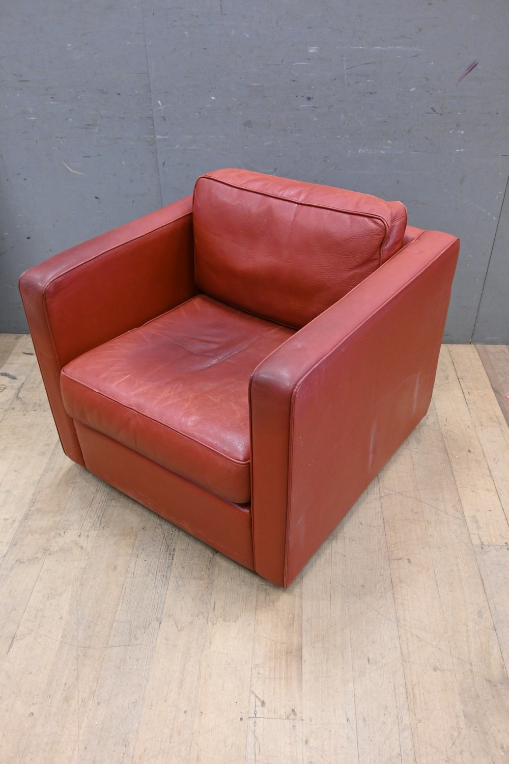 A DANISH RED LEATHER ARMCHAIR (A/F) (78H X 77W X 81D CM) (LEONARD JOEL DELIVERY SIZE: LARGE)