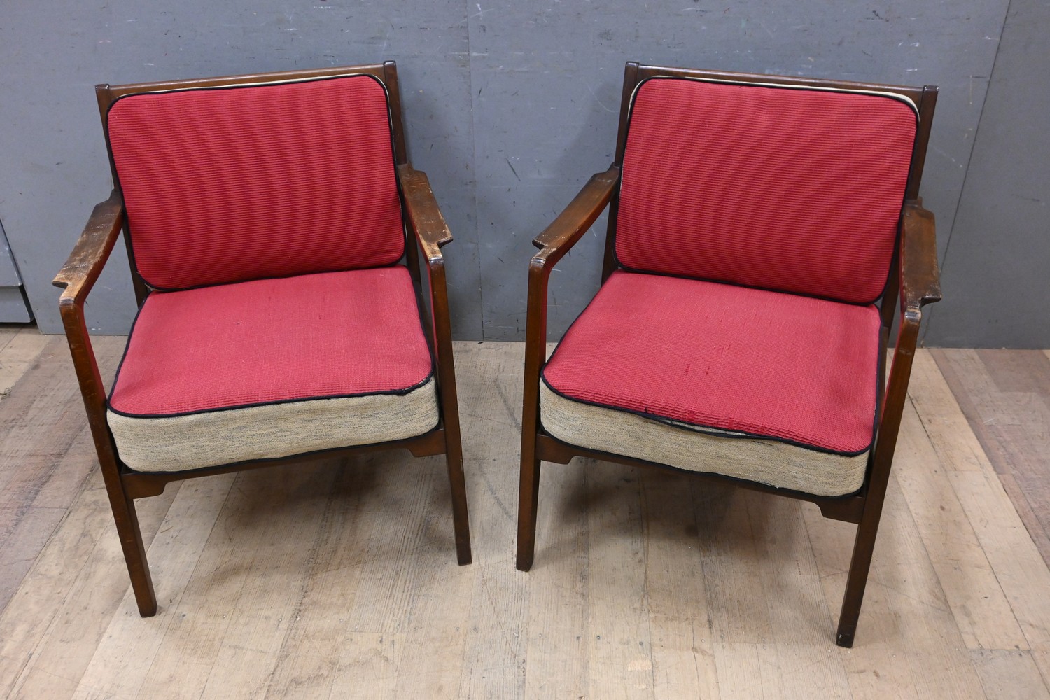 A PAIR OF MID-CENTURY DANISH ARMCHAIRS WITH RETRO CUSHIONS (A/F) (74H X 68W X 75D CM) (LEONARD JOEL DELIVERY SIZE: X-LARGE)