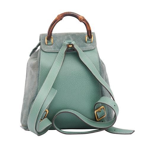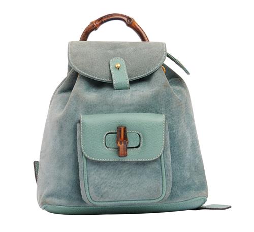 GUCCI, BAMBOO BACKPACK - Styled in dusty blue suede with blue leather trim, bamboo top handle and clasp, 21 x 25 x 7cm.