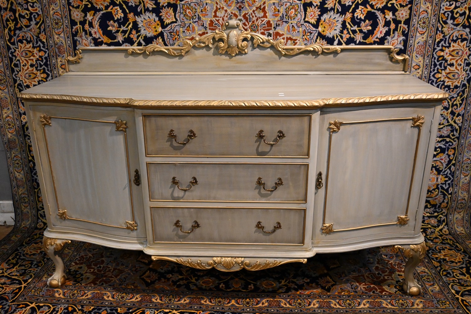 A PAINTED THREE DRAWER SIDEBOARD WITH BALL AND CLAW FEET (A/F) (132H X 192W X 65D CM) (PLEASE NOTE THIS HEAVY ITEM MUST BE REMOVED BY CLIENTS OR CARRIERS AT THE CUSTOMERS EXPENSE. LEONARD JOEL STAFF CANNOT ASSIST CARRYING THIS ITEM)