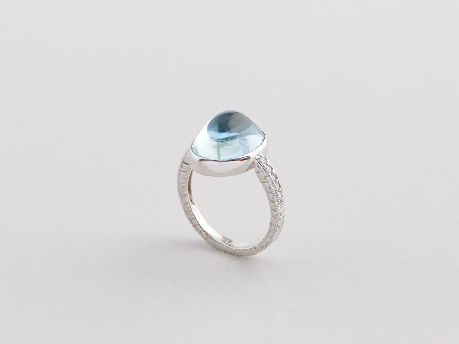 A BLUE TOPAZ AND DIAMOND RING IN 18CT WHITE GOLD, RING SIZE O, THE TOPAZ 12.75CTS, THE DIAMONDS 0.22CTS