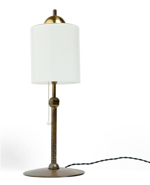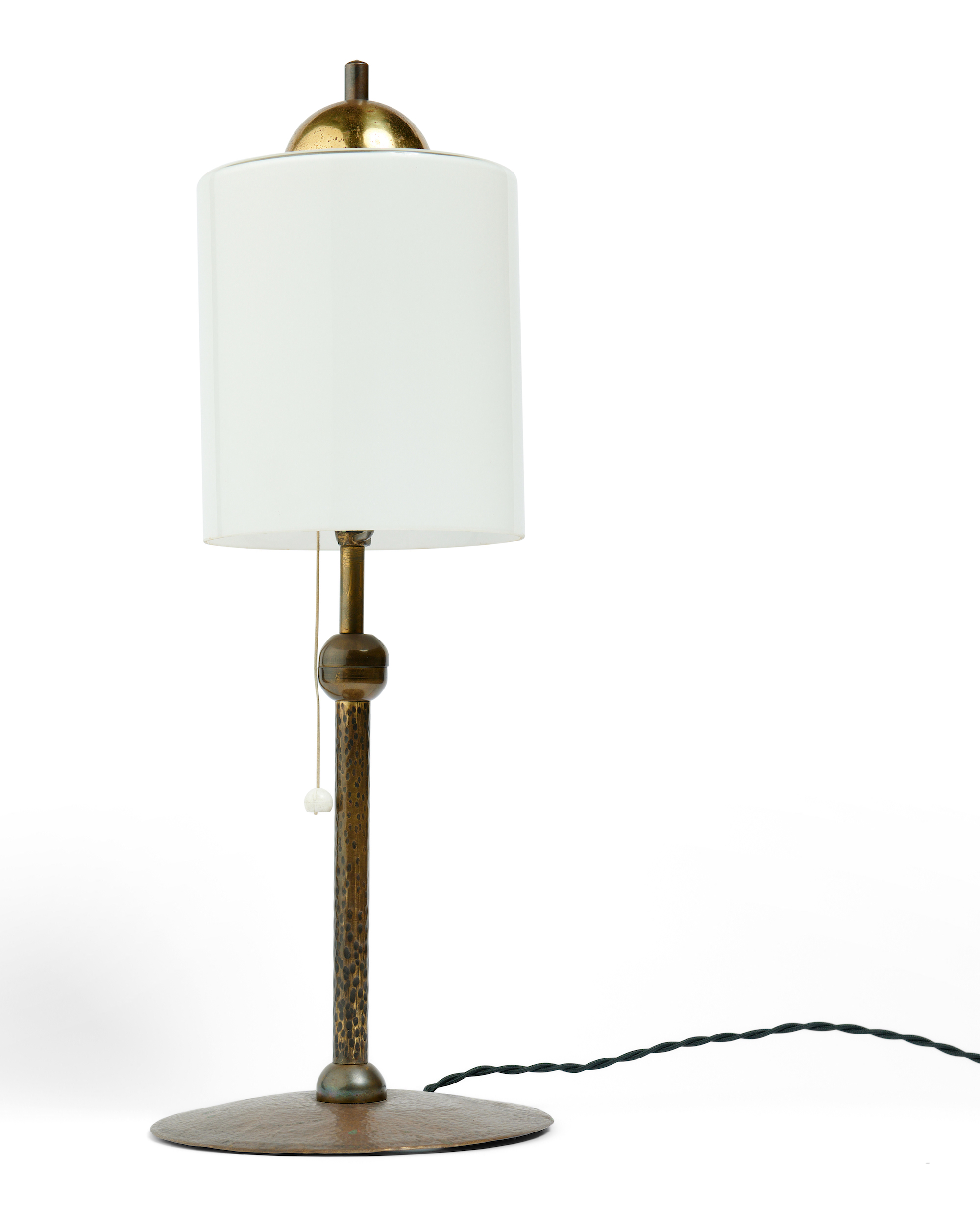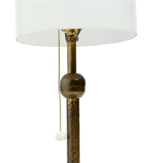 Hammered brass base with glass shade.