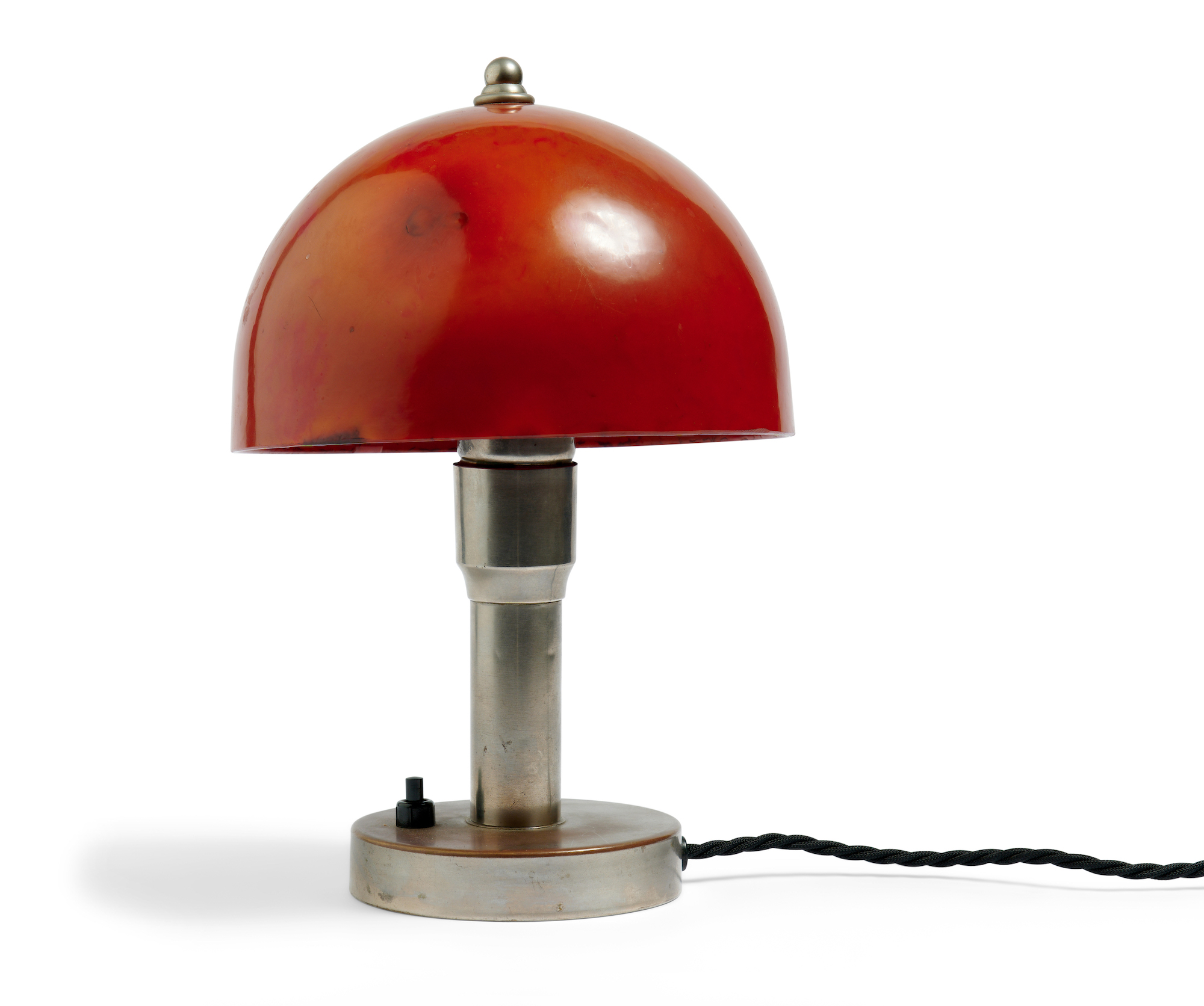 Marks and surface scratches present throughout the lights, all consistent with its age and previous use. Some discolouration and blackening to orange bakelite shade in areas, caused by heat from a globe (not recent). Minor patina development to nickel plating. No major losses.