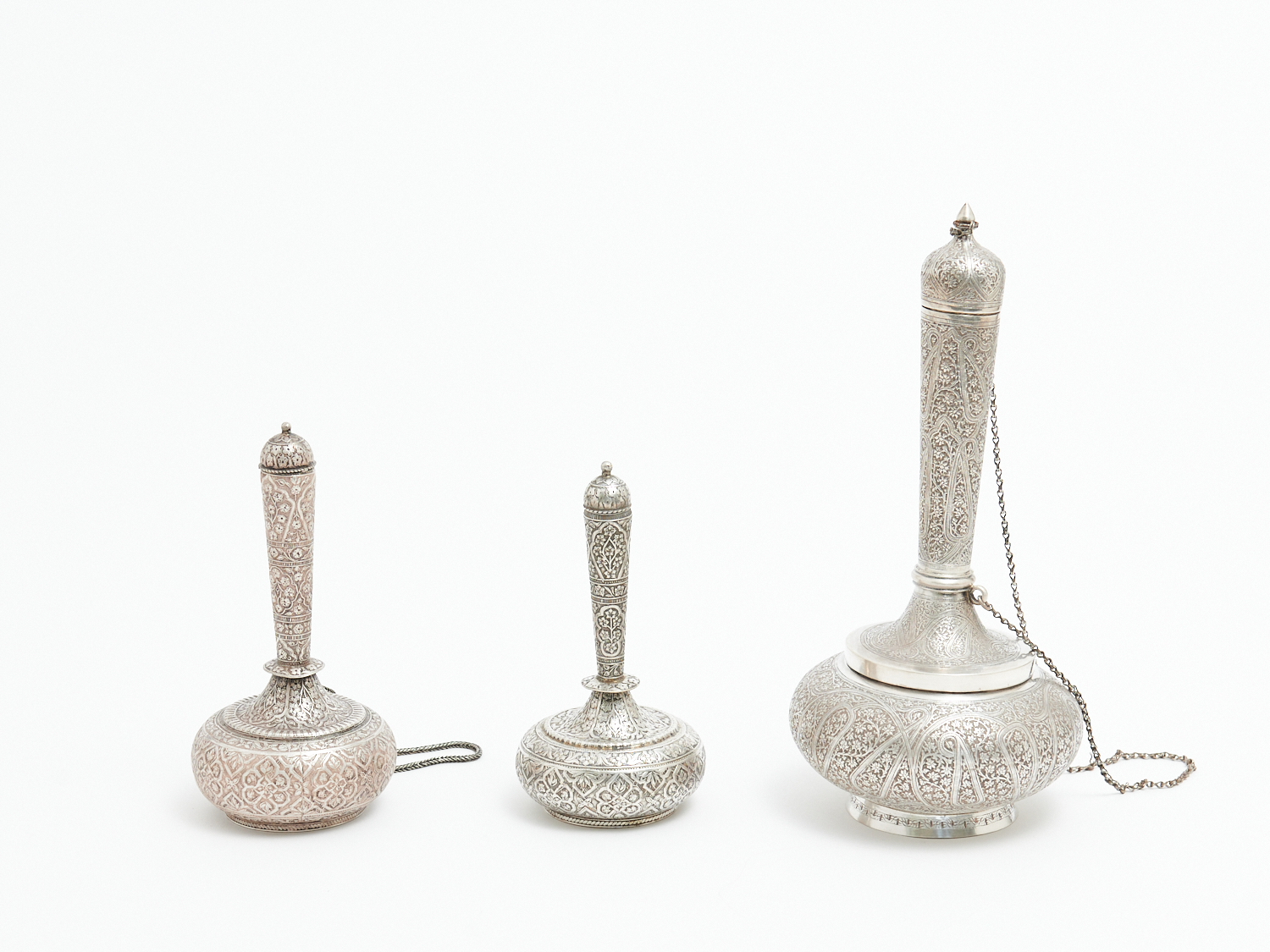 THREE KASHMIRI SILVER BOTTLES H.26CM, LEONARD JOEL LOCAL DELIVERY: SMALL