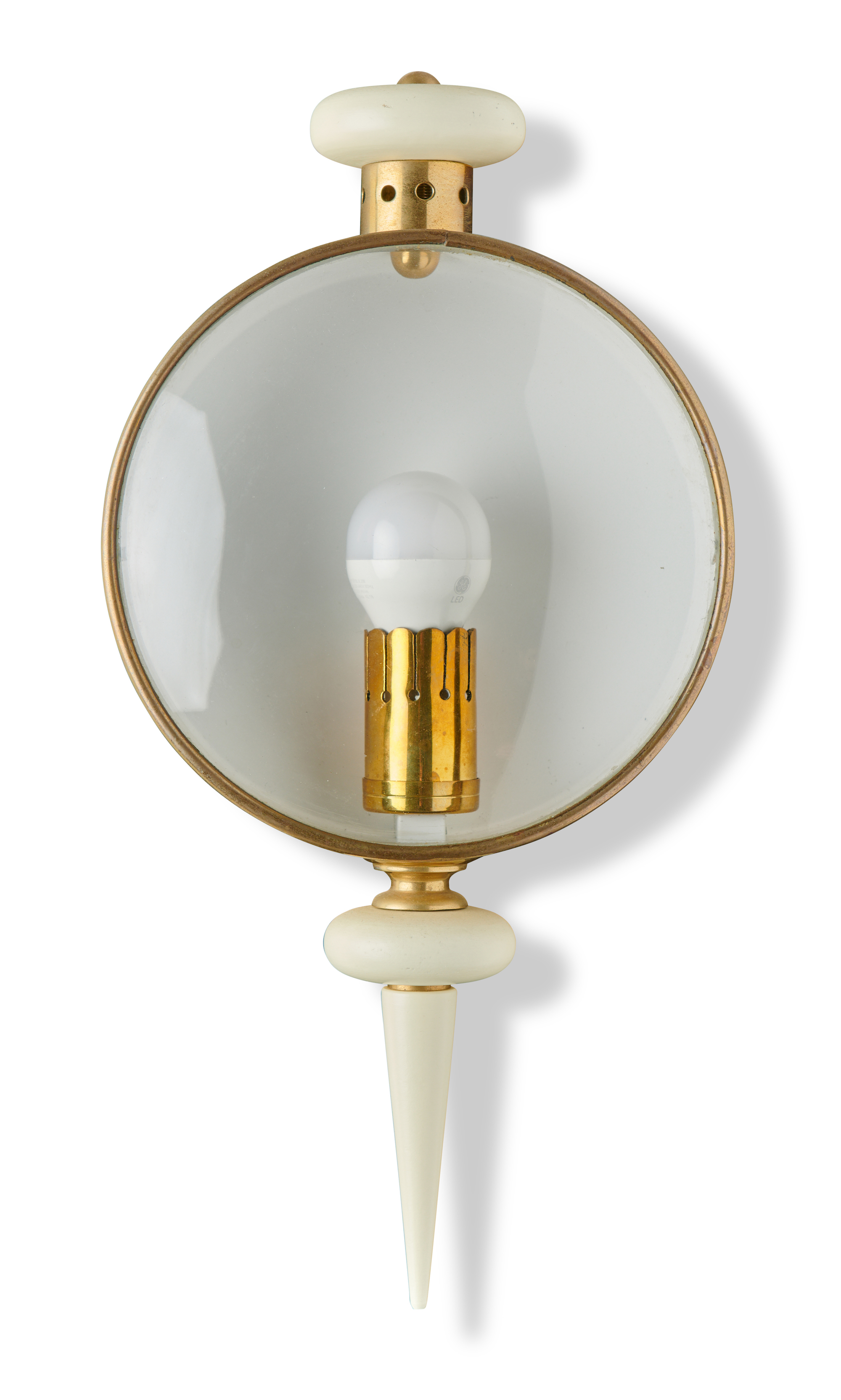 Cream metal and brass with domed glass front.