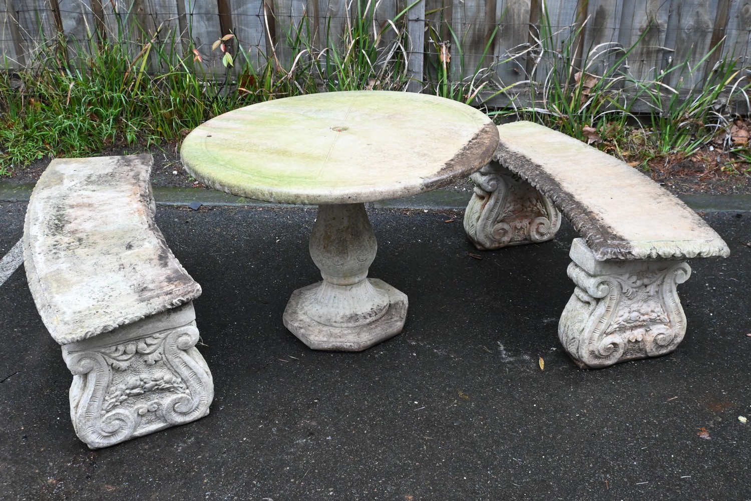 A THREE PIECE CONCRETE GARDEN SETTING (A/F) (67H X 92D CM) (PLEASE NOTE THIS HEAVY ITEM MUST BE REMOVED BY CLIENTS OR CARRIERS AT THE CUSTOMERS EXPENSE. LEONARD JOEL STAFF CANNOT ASSIST CARRYING THIS ITEM)