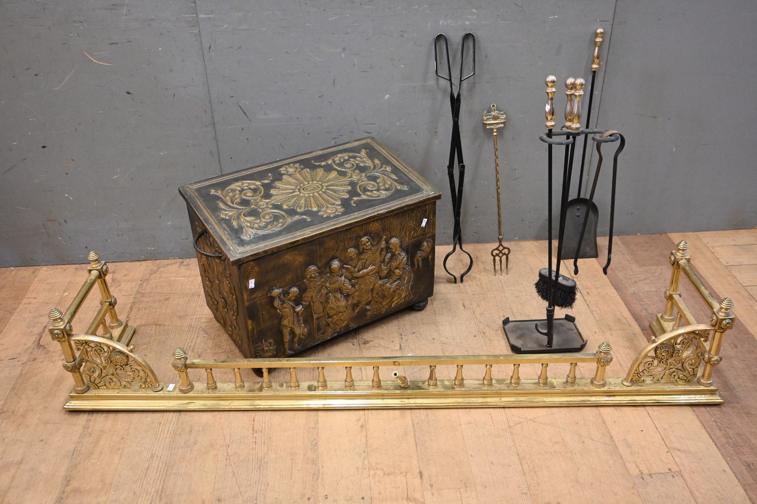 A COLLECTION OF BRASS FIRE PIECES INCLUDING FIRE TOOLS, FIREGUARD AND FIRE BOX (A/F) (GUARD 30H X 153W X 31D CM) (LEONARD JOEL DELIVERY SIZE: LARGE)