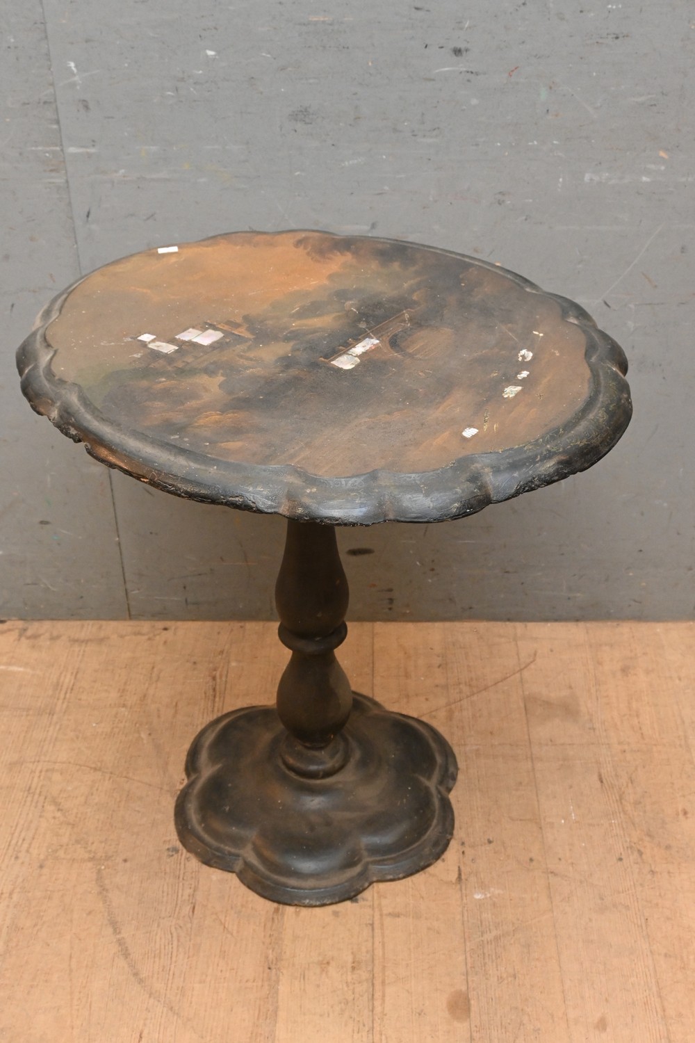 A VICTORIAN PAPIER MACHE OCCASIONAL TABLE WITH PAINTED TOP (A/F) ( 68H X 55W X 67D CM) (LEONARD JOEL DELIVERY SIZE: LARGE)