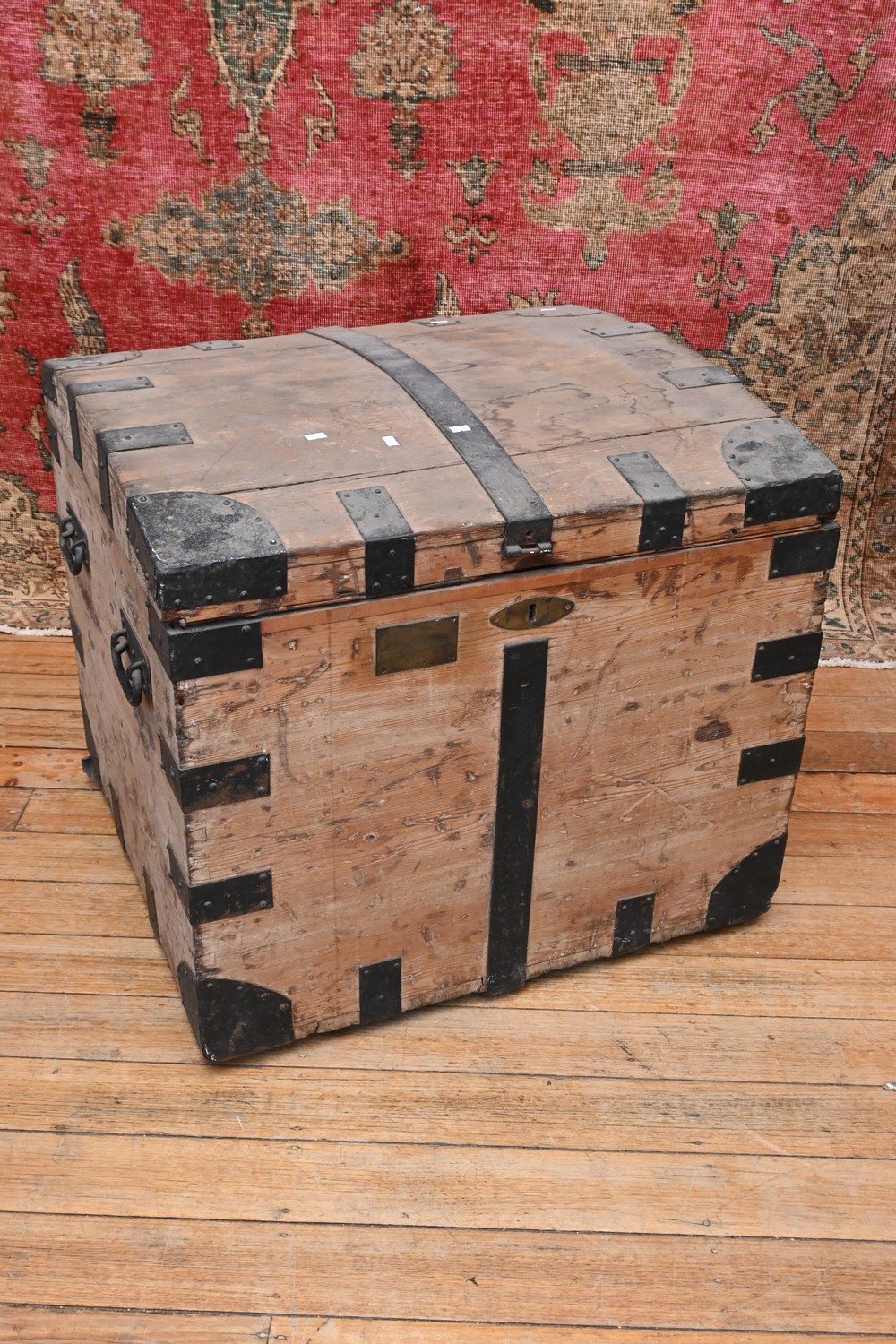 A 19th CENTURY IRON-BOUND PINE CHEST (A/F) (68H X 72D CM) (PLEASE NOTE THIS HEAVY ITEM MUST BE REMOVED BY CLIENTS OR CARRIERS AT THE CUSTOMERS EXPENSE. LEONARD JOEL STAFF CANNOT ASSIST CARRYING THIS ITEM)