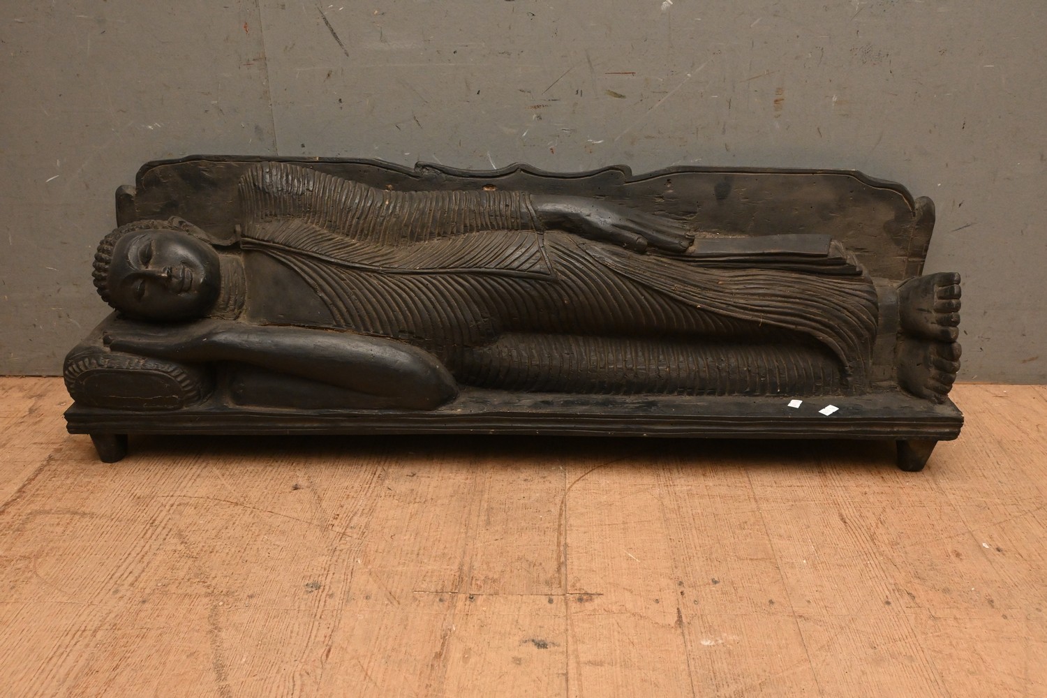 AN ASIAN CARVED HARDWOOD FIGURE OF THE SLEEPING BUDDHA  (A/F) ( 34H X 104W X 25D CM) (LEONARD JOEL DELIVERY SIZE: LARGE)