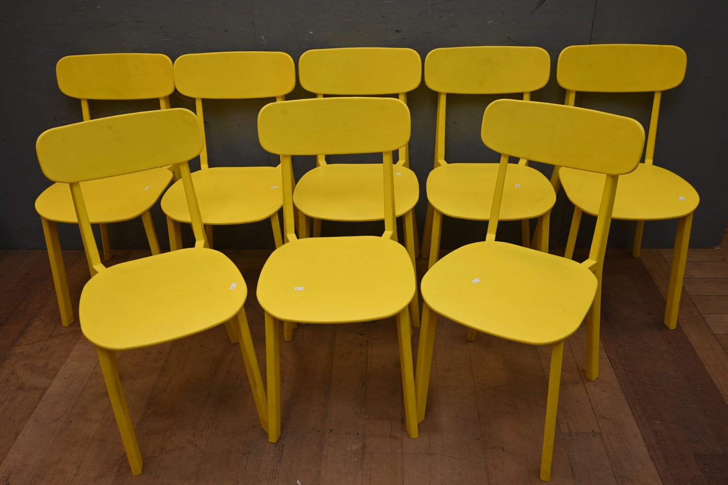 A SET OF EIGHT YELLOW MOULDED PLASTIC DINING CHAIRS (80H X 40W X 50D CM) (A/F) (LEONARD JOEL DELIVERY SIZE: X-LARGE)