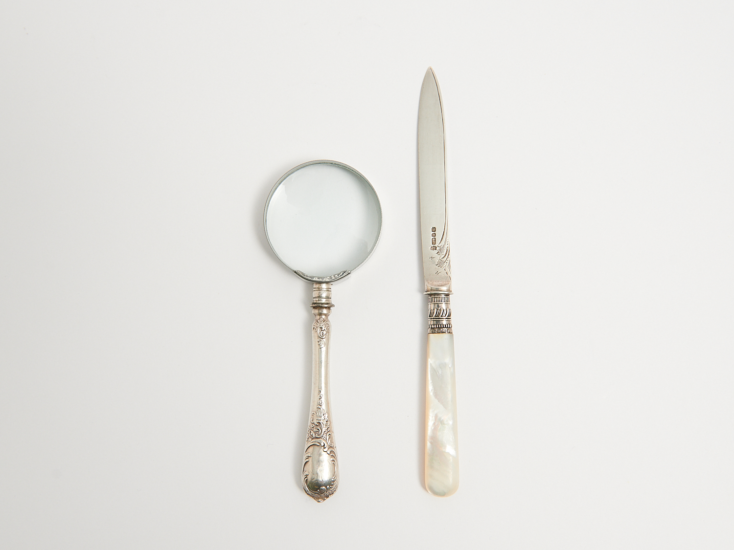AN 800 SILVER HANDLED MAGNIFYING GLASS AND STERLING SILVER COLLARED LETTER OPENER L.18.5CM (TALLEST), LEONARD JOEL LOCAL DELIVERY: SMALL