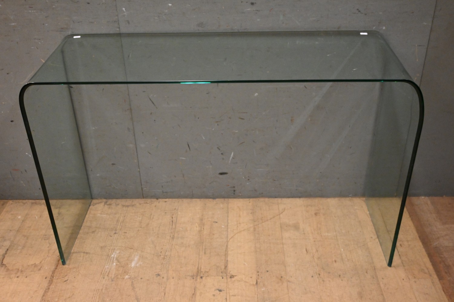 A CONTEMPORARY CURVED GLASS CONSOLE (A/F) (75H X 123W X 40D CM) (PLEASE NOTE THIS HEAVY ITEM MUST BE REMOVED BY CLIENTS OR CARRIERS AT THE CUSTOMERS EXPENSE. LEONARD JOEL STAFF CANNOT ASSIST CARRYING THIS ITEM)