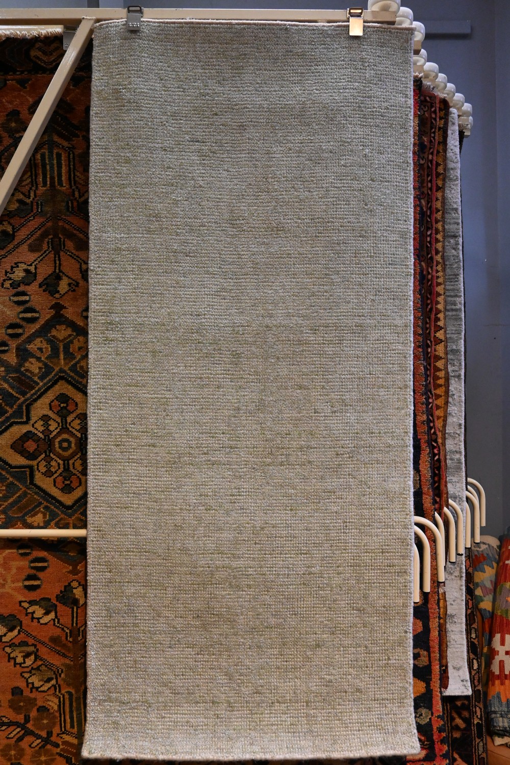 MODERN HANDLOOMED RUG, SILKY TEXTURE. IN TONES OF CREAM AND GREEN. ORIGIN: INDIA - SIZE: 170 X 76 CM