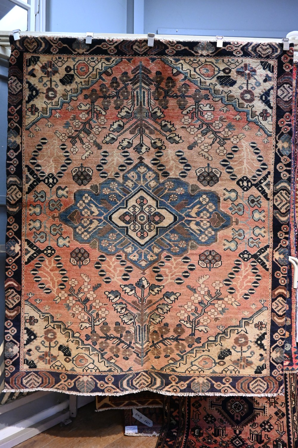 A PERSIAN CIRCA 1960'S NAHAVAND RUG. 100% WOOL, VINTAGE PILE NATURAL DYES. HAND-KNOTTED VILLAGE WEAVE WITH RARE DESIGN OF BOLD STYLIZED MEDALLION IN FRENCH BLUE SET WITHIN A FIELD OF VARYING FLORAL & TRIBAL PATTERNS. BORDER OF FLORAL SHRUBS & GEOMETRIC PATTERNS. SIZE: 200 X 162 CM ORIGIN: PERSIA - RRP: $2,600 DOCUMENTATION OF AUTHENTICITY INCLUDED.