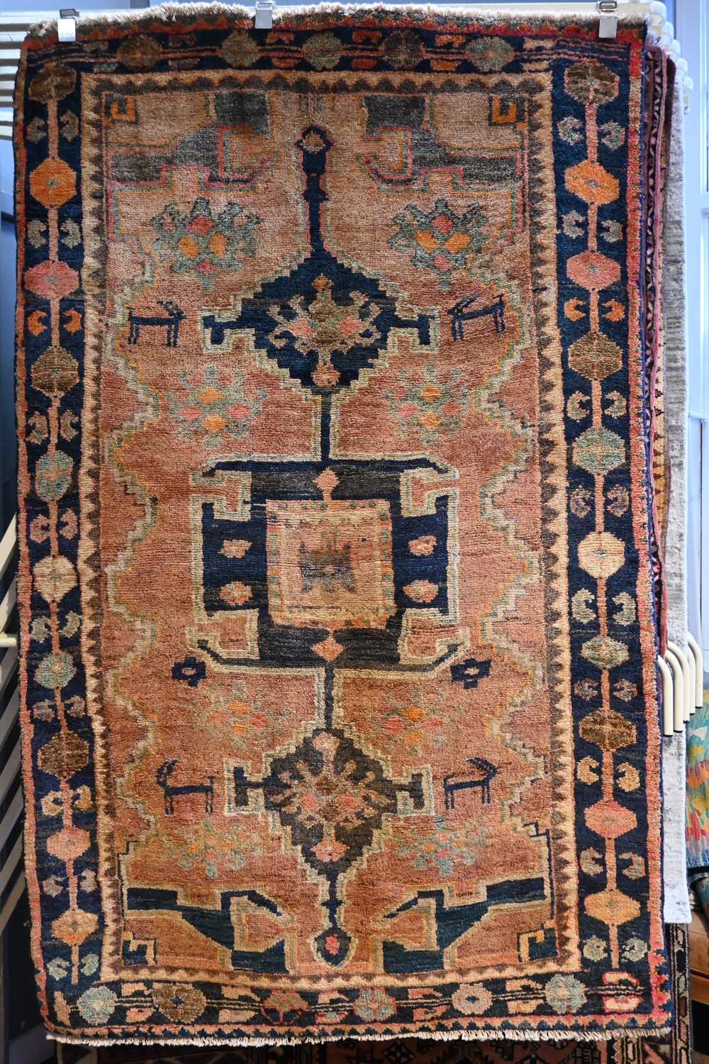 A TRIBAL PERSIAN LURI RUG. 100% WOOL. NATURAL DYES. HAND-KNOTTED TRIBAL WEAVE WITH A DESIGN OF A GEOMETRIC MEDALLION IN A SOFT BURNT ORANGE WITH GEOMETRIC PATTERNS & ANIMAL MOTIFS. NAVY BLUE BORDER OF TRIBAL ROSETTES. SIZE: 198 X 123 CM ORIGIN: PERSIA - RRP: $2,100 DOCUMENTATION OF AUTHENTICITY INCLUDED.