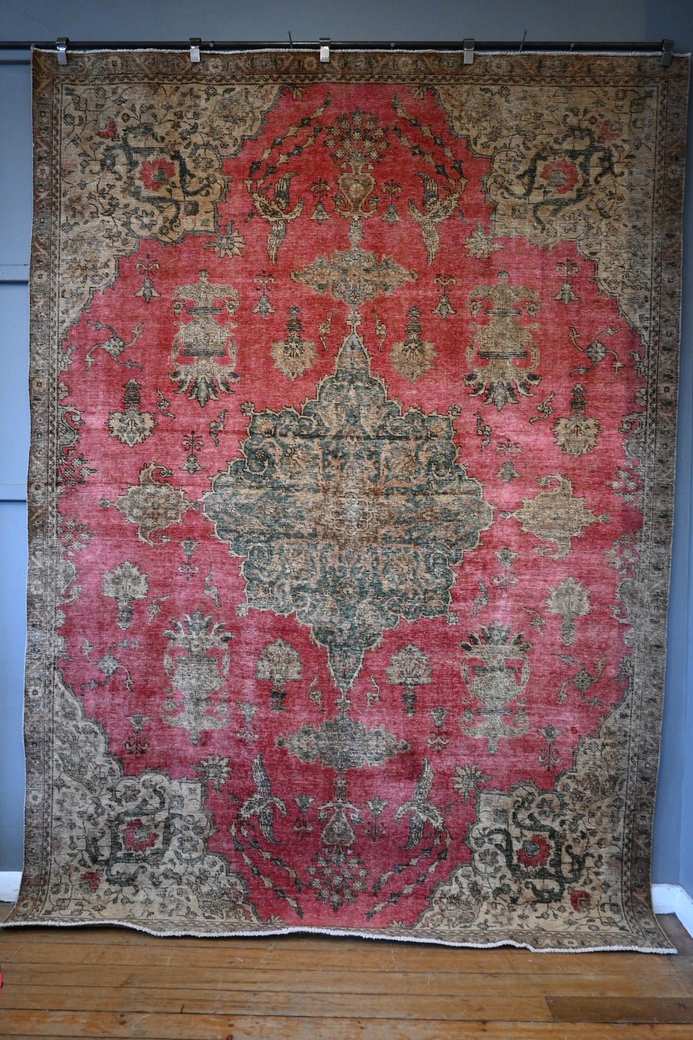 A BEAUTIFUL VINTAGE OVER-DYED PERSIAN TABRIZ CARPET, VINTAGE PILE. A UNIQUE MODERN CARPET CREATED FROM AN AUTHENTIC VINTAGE ELONGATED MEDALLION DESIGN TABRIZ CARPET WITH THE PILE SHORN AND OVER-DYED IN CHARCOAL, TEAL & RED TONES. WITH URNS BEARING FOLIAGE AND BIRDS OF PHOENIX A TRULY LOVELY PIECE. EX GALLERY EXHIBITED. SIZE: 330 X 235 CM ORIGIN: PERSIA - RRP: $5,900 DOCUMENTATION OF AUTHENTICITY INCLUDED