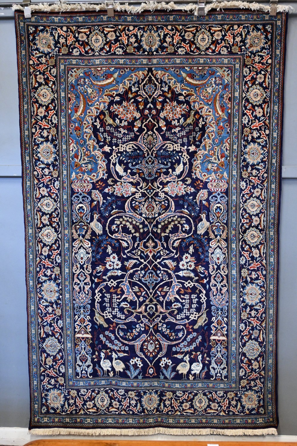 A COLLECTABLE PERSIAN KASHAN CARPET CIRCA 1970'S. VERY FINELY & DENSELY HAND-KNOTTED WITH THE FINEST LAMBS WOOL AND INTER WOVEN WITH SILK. THE CARPET CONTAINING PILLARS OF WISDOM ALL OVER ESLIMI SCROLLS ON A PERSIAN BLUE FIELD. WITH SHAH ABBASI, FLORAL & BIRD MOTIFS AND TENDRILS HIGHLIGHTED WITH GOLD, COGNAC, CREAM AND FRENCH BLUE SURROUNDINGS WITH AN ALL OVER & INTRICATE ELEGANT DESIGN. SIZE: 201 X 138 CM ORIGIN: PERSIA - RRP: $4,800 DOCUMENTATION OF AUTHENTICITY INCLUDED.