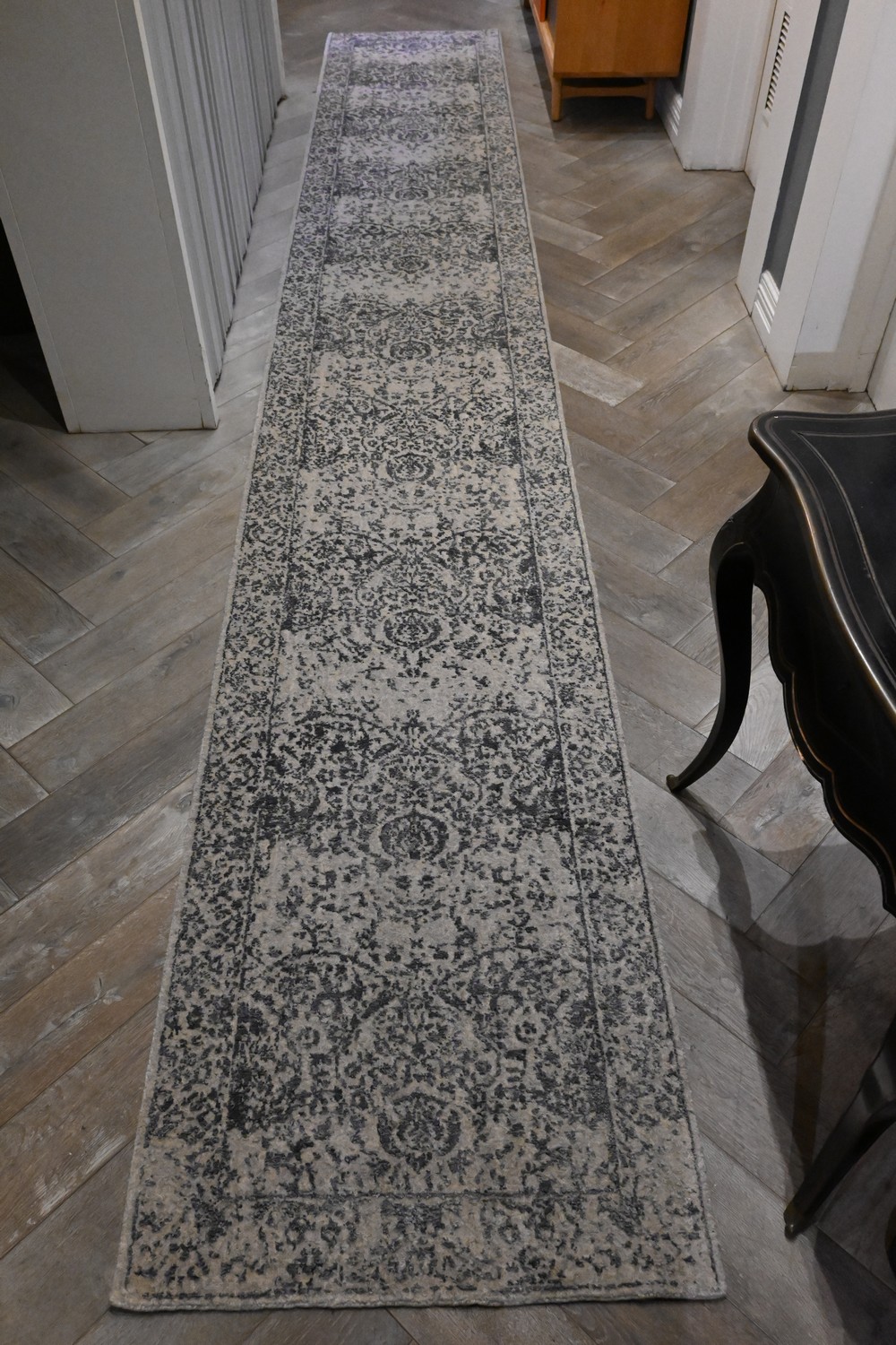 A BRAND NEW MODERN TRANSITIONAL COLLECTION RUNNER. HAND LOOMED. WOOL AND BAMBOO SILK. IN TONES OF GREY AND CHARCOAL. SIZE: 503 X 78 CM - RRP: $2,800 ORIGIN: INDIA DOCUMENTATION OF AUTHENTICITY INCLUDED