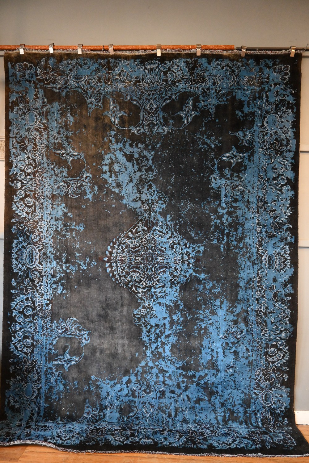 A UNIQUE MODERN TRANSITIONAL KERMAN PERSIAN DESIGNER RUG. FINELY WOVEN IN IRAN. 100 % WOOL PLUSH PILE. CENTRAL ELONGATED MEDALLION AND A BORDER OF PALMETTES FLORAL SPRAYS. IN TONES OF CHARCOAL AND BLUE AND A HINT OF BURGUNDY. NEVER WALKED ON. SIZE: 348 X 250 CM ORIGIN: PERSIA - RRP: $8,500 DOCUMENTATION OF AUTHENTICITY INCLUDED.