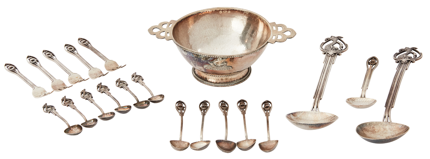 First half 20th century, marked JAL, comprising a quaich style sugar bowl with hammered body and pierced handles, having a ship motif to one side, a matching spoon and a set of five teaspoons and cake forks similar; a pair of large serving spoons with hammered bowls and dolphin finial, and six coffee spoons ensuite.
