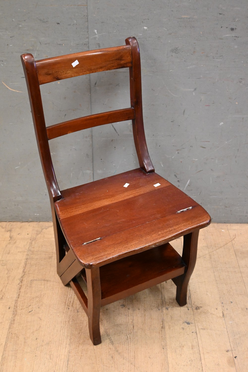 A MAHOGANY METAMORPHIC LIBRARY CHAIR (83H X 44W X 49D CM) (LEONARD JOEL DELIVERY SIZE: MEDIUM)