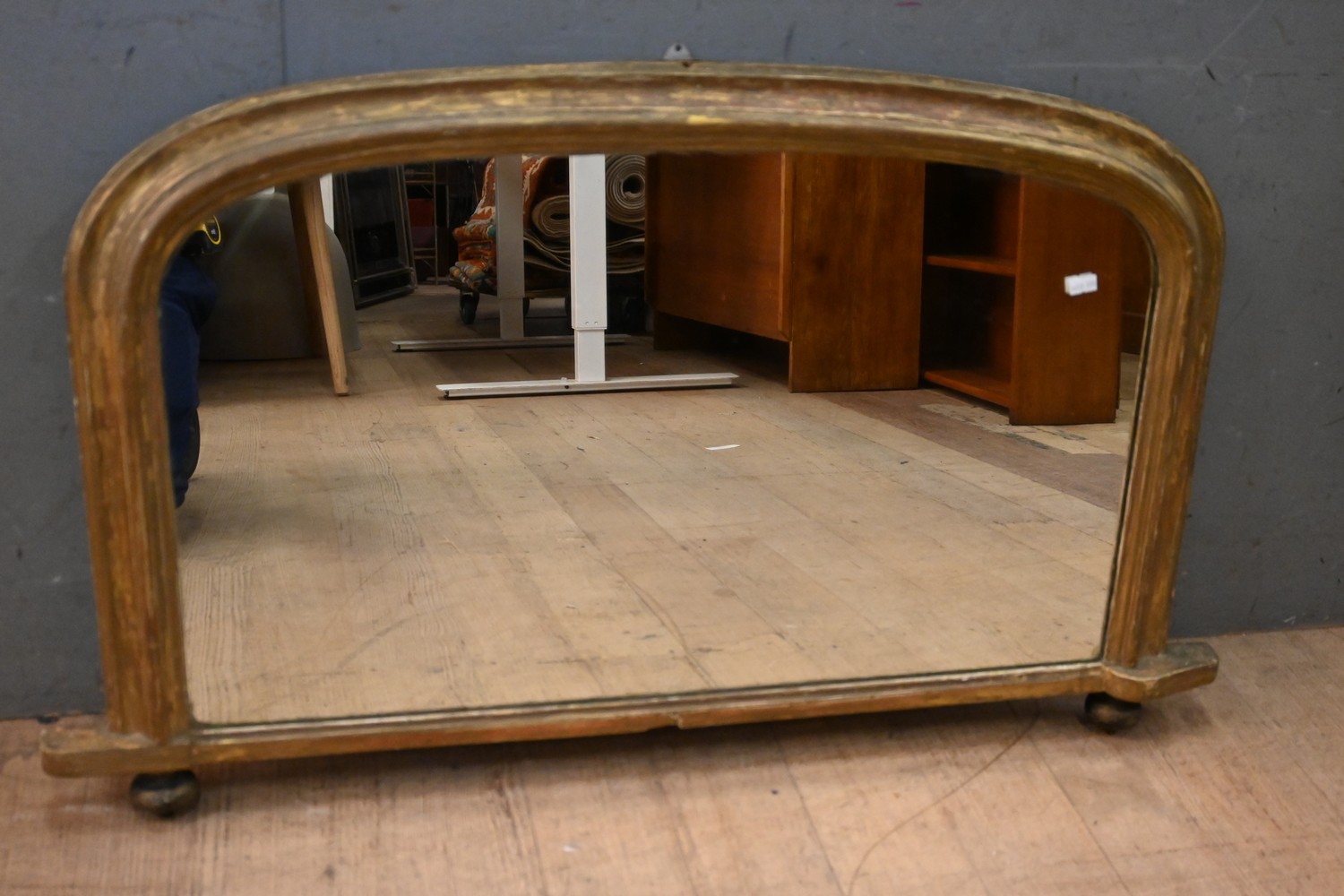 A VICTORIAN GILT WOODEN FRAMED OVER MANTLE MIRROR (A/F) (57H X 94W CM) (LEONARD JOEL DELIVERY SIZE: MEDIUM)