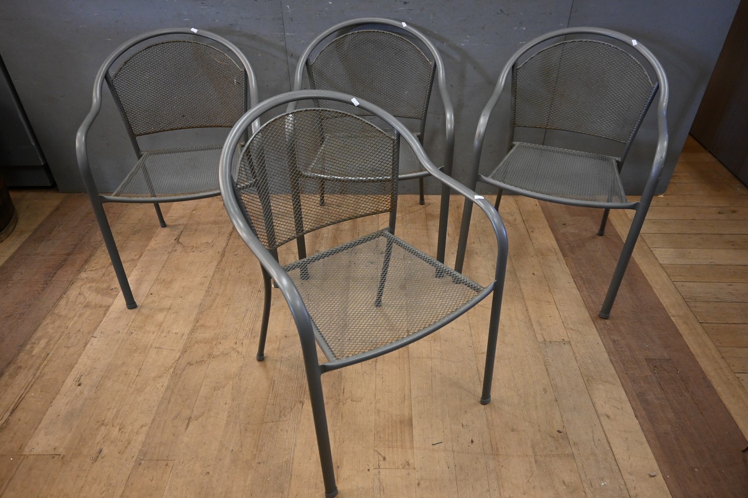 A SET OF 4 VINTAGE STEEL FRAMED STACKING ARM CHAIRS (A/F) (80H X 56W X 63D CM) (LEONARD JOEL DELIVERY SIZE: LARGE)