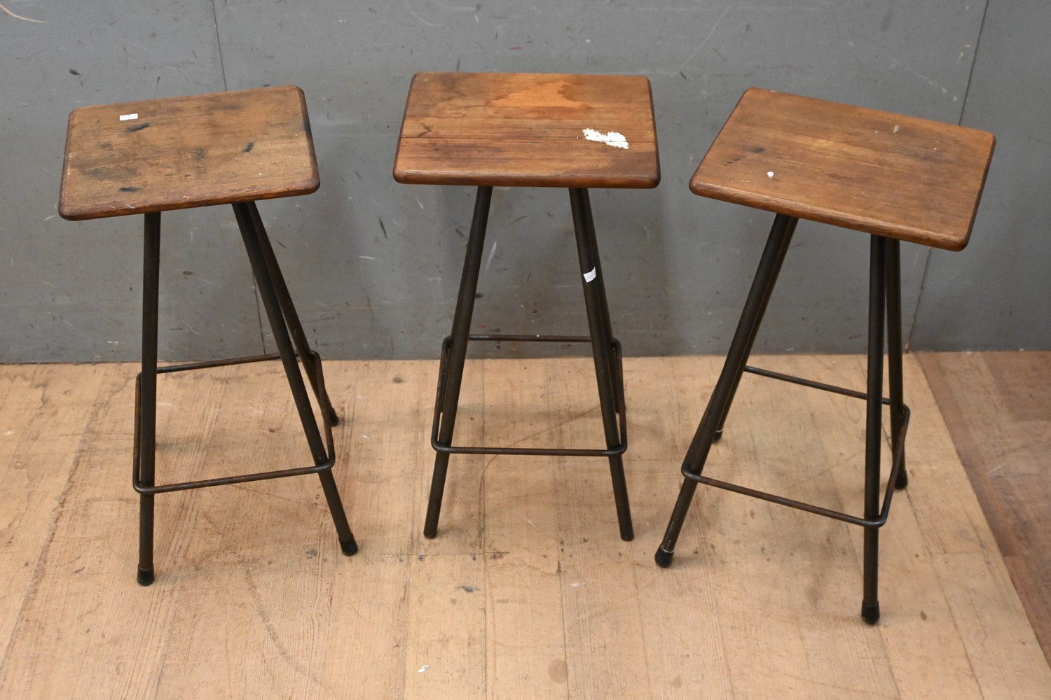 THREE VINTAGE STEEL FRAMED AND WOODEN TOPPED STOOLS (62H X 33W X 27D CM) (LEONARD JOEL DELIVERY SIZE: LARGE)