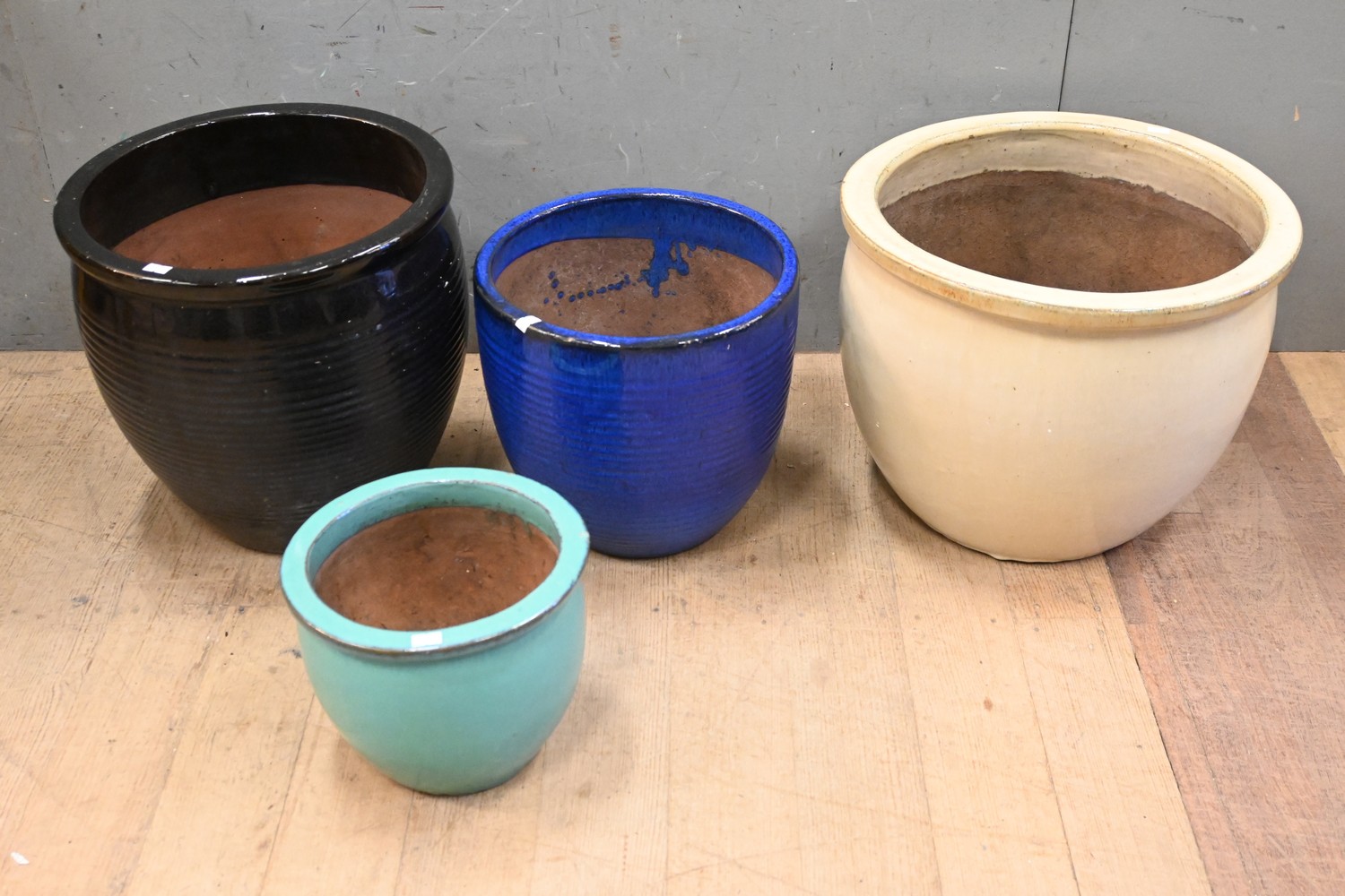 A COLLECTION OF 4 VINTAGE GLAZED CIRCULAR PLANTER POTS (LARGEST 34H X 42D CM) (LEONARD JOEL DELIVERY SIZE: LARGE)