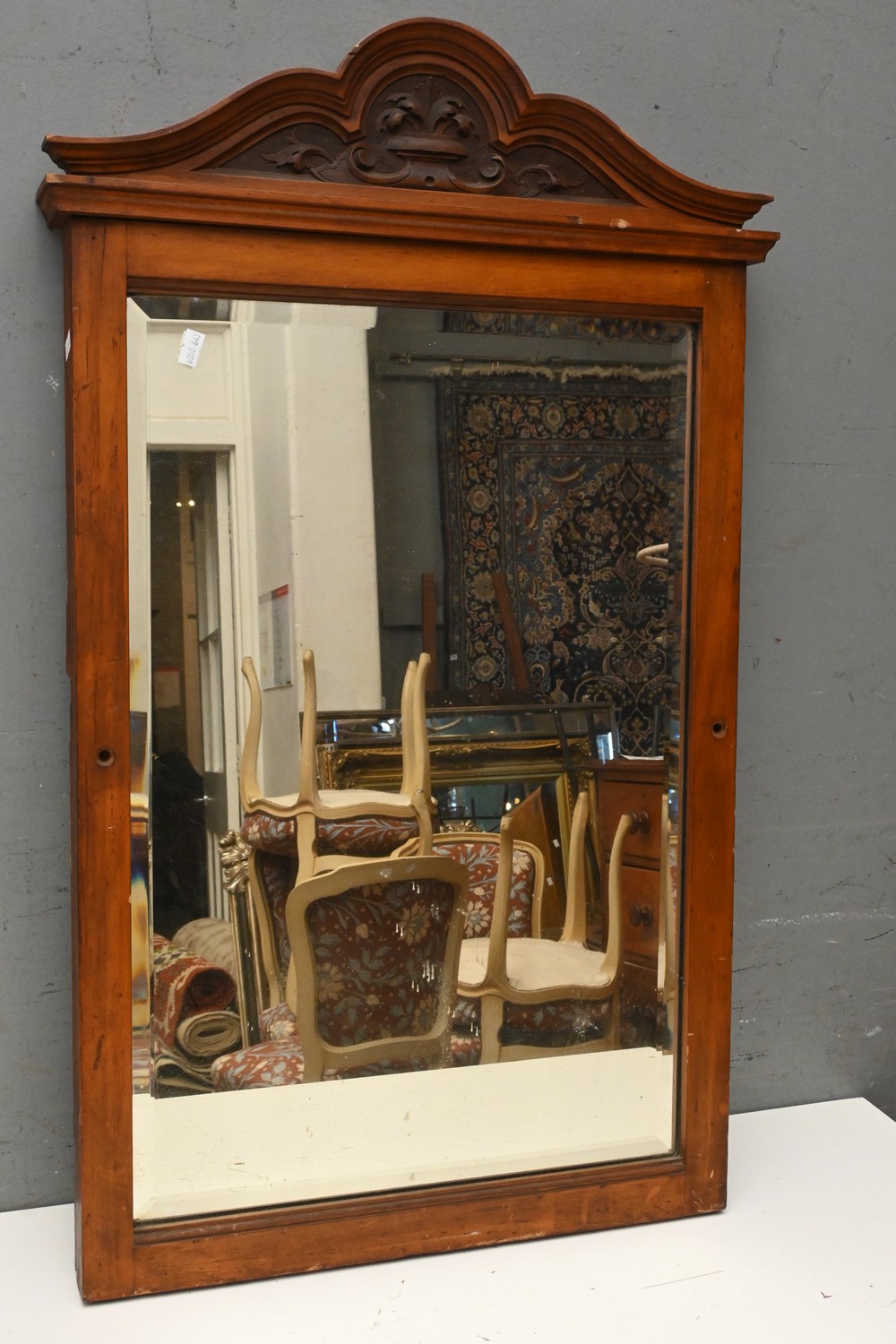 AN AUSTRALIAN PINE CARVED TOPPED BEVEL MIRROR ( A/F) ( 83H X 51W CM) LEONARD JOEL DELIVERY SIZE: LARGE)