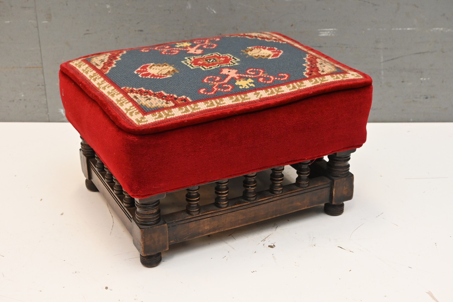 AN ENGLISH TAPESTRY TOPPED OAK COTTON REEL FORM BASED FOOTSTOOL ( 20H X 36W X 28D CM) (LEONARD JOEL DELIVERY SIZE: MEDIUM)