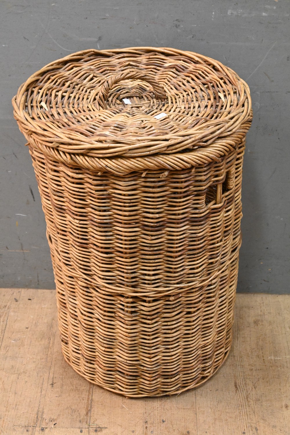 A VINTAGE CIRCULAR LIDDED CANE BASKET (64H X 44D CM) (LEONARD JOEL DELIVERY SIZE: MEDIUM)