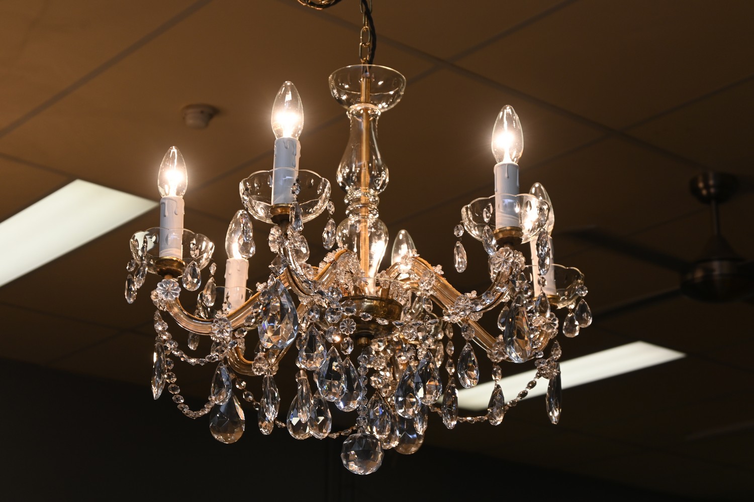 A MID 20TH CENTURY CZECH CRYSTAL SIX BRANCH CHANDELIER (57H X 43D CM) (LEONARD JOEL DELIVERY SIZE: LARGE)