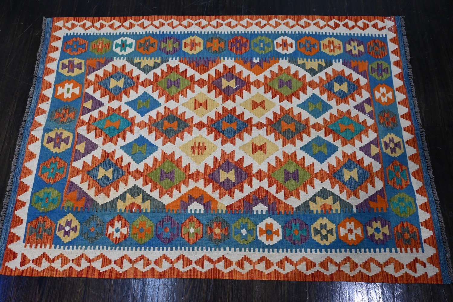 AN AFGHAN 100% WOOL CAUCASIAN DESIGN KILIM, REVERSABLE, ALL VEGETABLE DYES (208 X 147 CM)