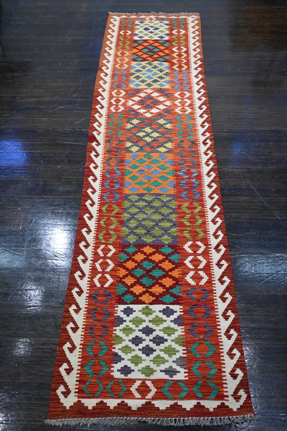 AN AFGHAN 100% WOOL CAUCASIAN DESIGN RUNNER, REVERSABLE, ALL VEGETABLE DYES (305 X 78 CM)