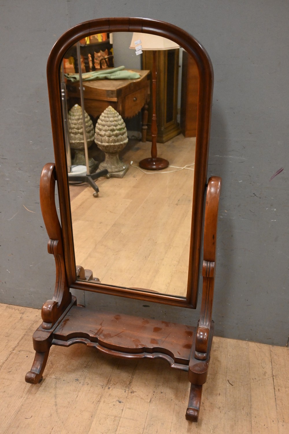 AN EARLY VICTORIAN MAHOGANY CHEVAL MIRROR (A/F) (153H X 79W X 57D CM) (LEONARD JOEL DELIVERY SIZE: X-LARGE)