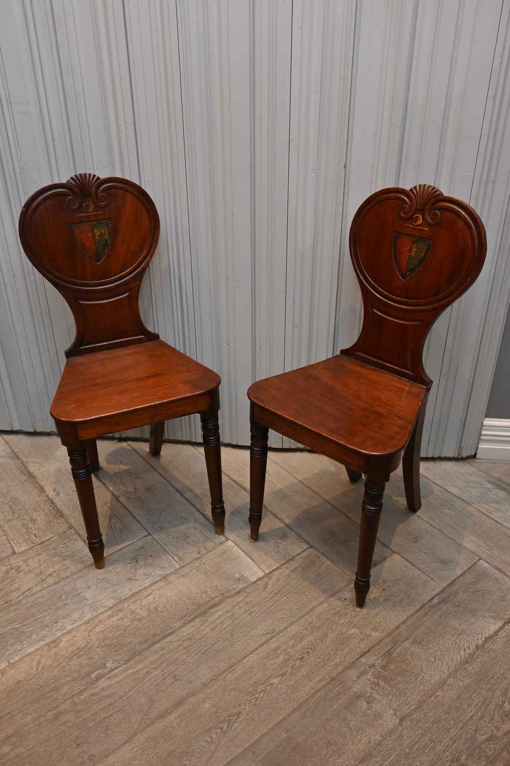 A PAIR OF REGENCY MAHOGANY HALL CHAIRS, THE BACK OF EACH WITH A PAINTED ARMORIAL CENTRE - SIGNS OF REPAIR (A/F) (87H X 40W X 42D CM) (LEONARD JOEL DELIVERY SIZE: LARGE)
