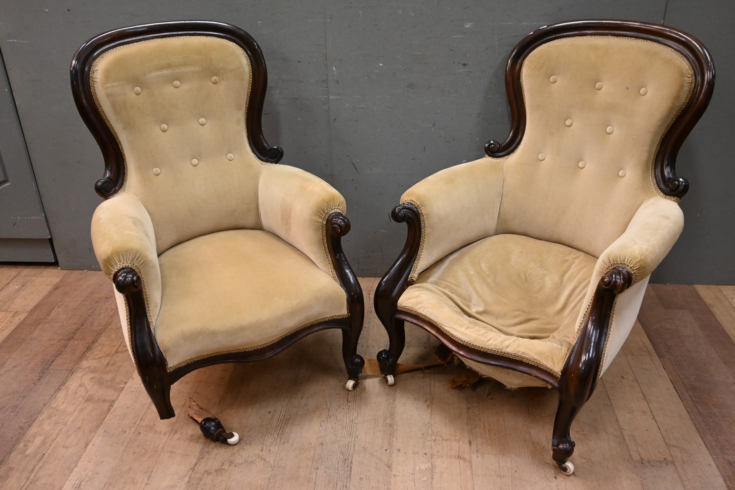 TWO VICTORIAN STAINED CEDAR AND UPHOLSTERED ARMCHAIRS (102H X 69W X 89D CM) (LEONARD JOEL DELIVERY SIZE: X-LARGE)