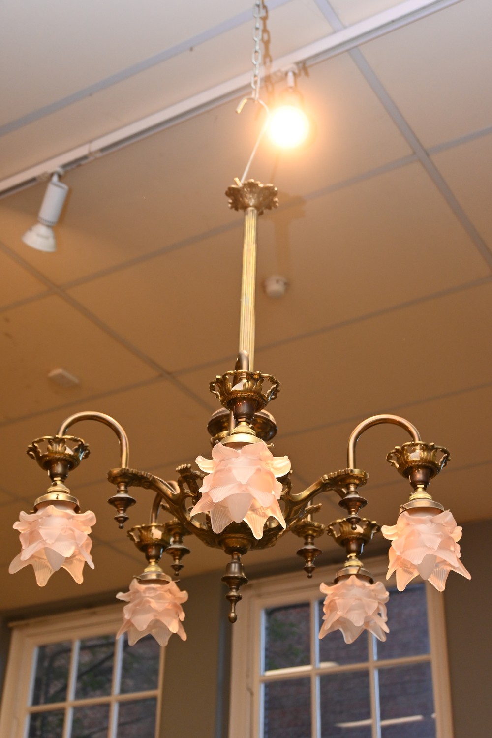 A BRASS SIX-LIGHT CHANDELIER WITH MOULDED PINK GLASS SHADES (73H X 64D CM) (LEONARD JOEL DELIVERY SIZE: LARGE)