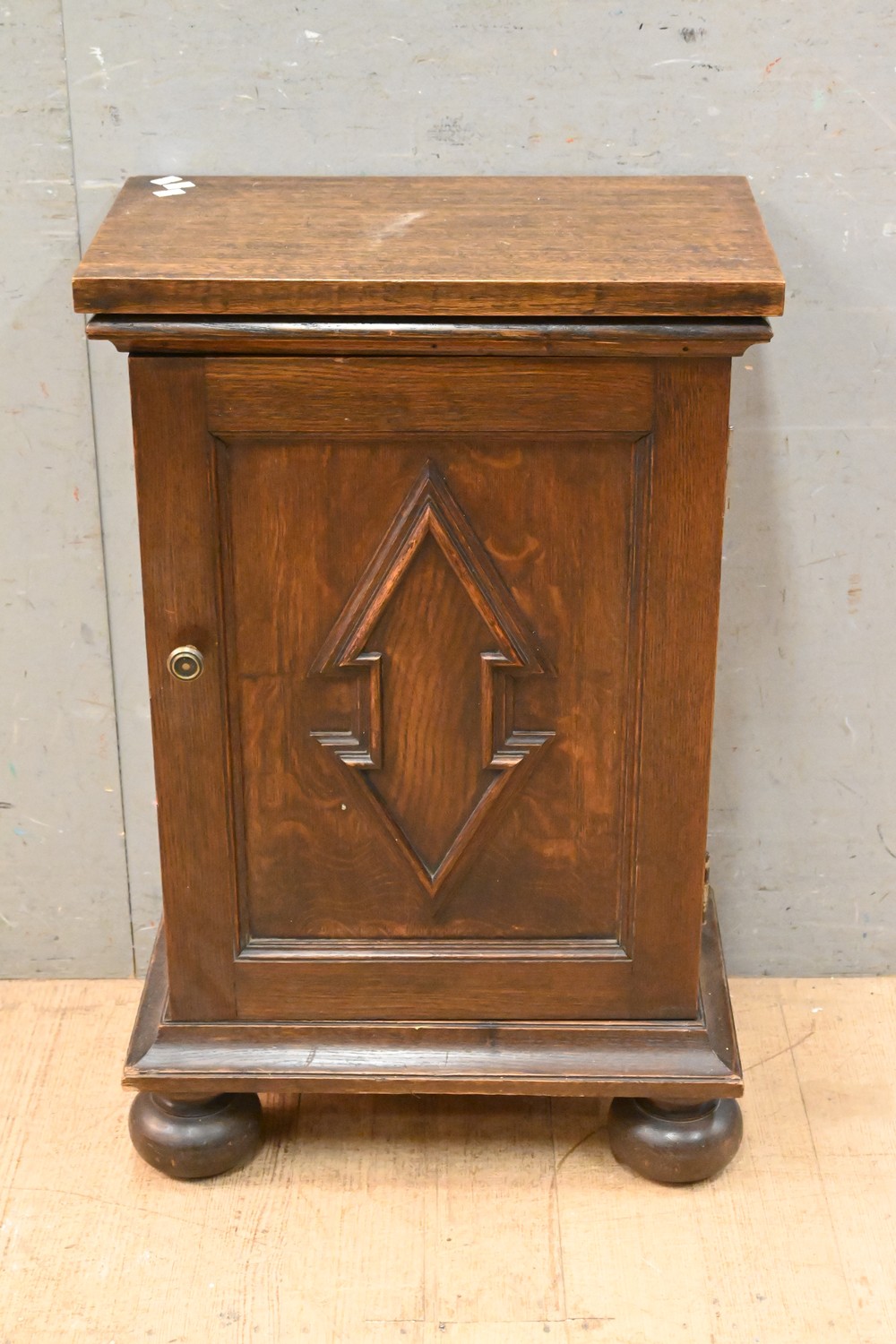 A STAINED OAK PEDESTAL CABINET IN 17TH CENTURY ENGLISH STYLE (A/F) (74H X 48W X 28D CM) (LEONARD JOEL DELIVERY SIZE: LARGE)