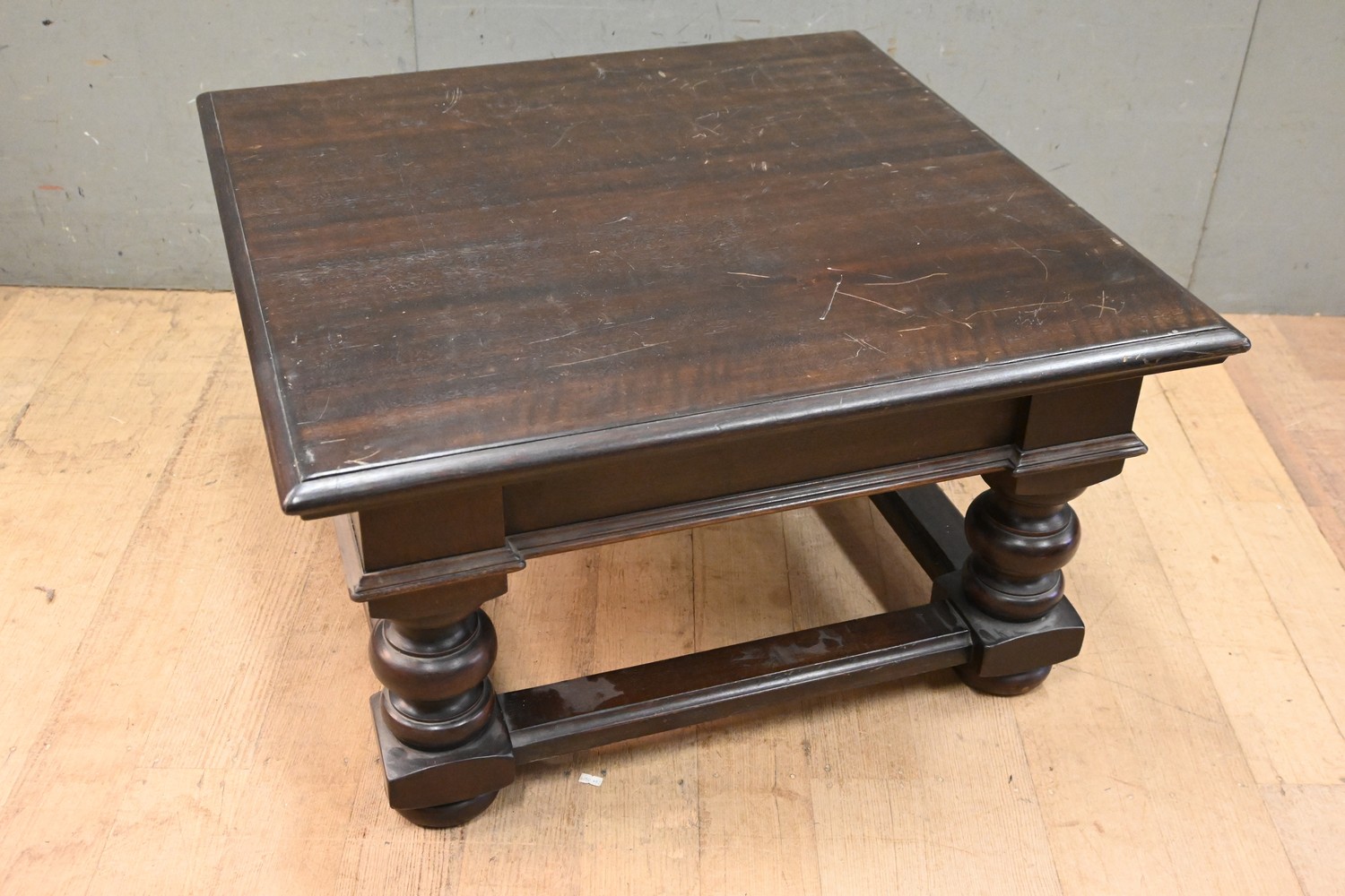 A STAINED HARDWOOD SQUARE LOW TABLE IN ANTIQUE MANNER (A/F) (PLEASE NOTE THIS HEAVY ITEM MUST BE REMOVED BY CLIENTS OR CARRIERS AT THE CUSTOMERS EXPENSE. LEONARD JOEL STAFF CANNOT ASSIST CARRYING THIS ITEM)