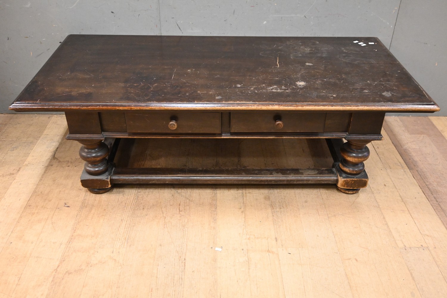 A STAINED HARDWOOD RECTANGULAR LOW TABLE IN ANTIQUE MANNER (A/F) (45H X 148W X 71D CM) (PLEASE NOTE THIS HEAVY ITEM MUST BE REMOVED BY CLIENTS OR CARRIERS AT THE CUSTOMERS EXPENSE. LEONARD JOEL STAFF CANNOT ASSIST CARRYING THIS ITEM)