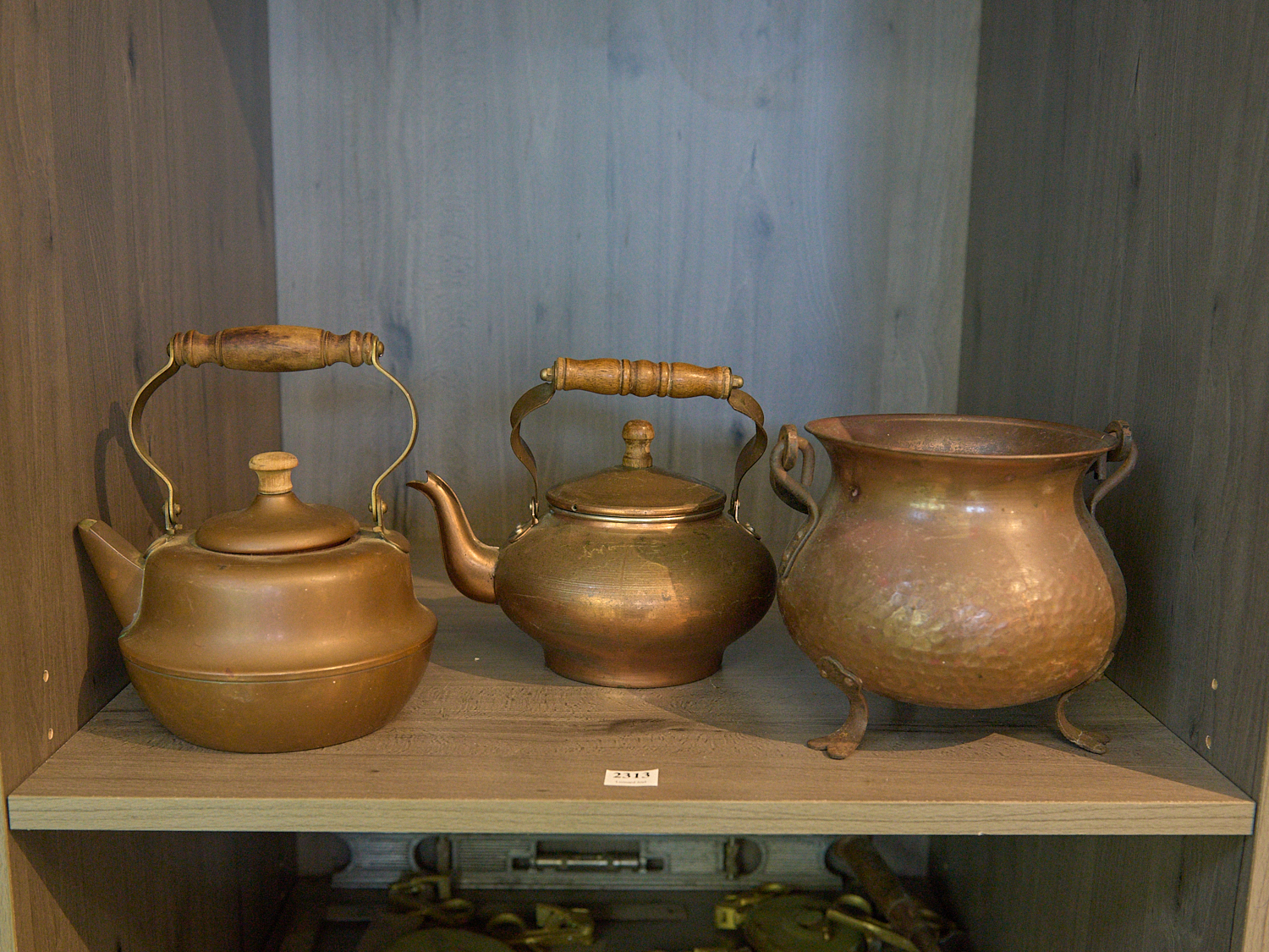 A GROUP COPPER ITEMS INCLUDING TEA POTS H.16CM (TALLEST), LEONARD JOEL LOCAL DELIVERY: SMALL
