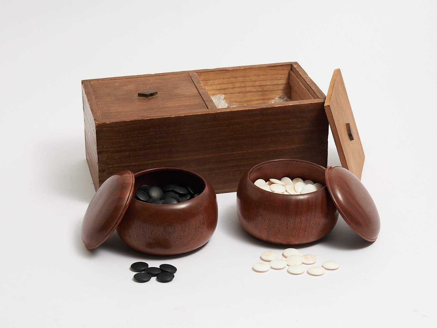 A SET OF VINTAGE JAPANESE HYUGA CLAMSHELL AND NACHIGURO SLATE BACK STONE GO CHESS, LEONARD JOEL LOCAL DELIVERY: SMALL