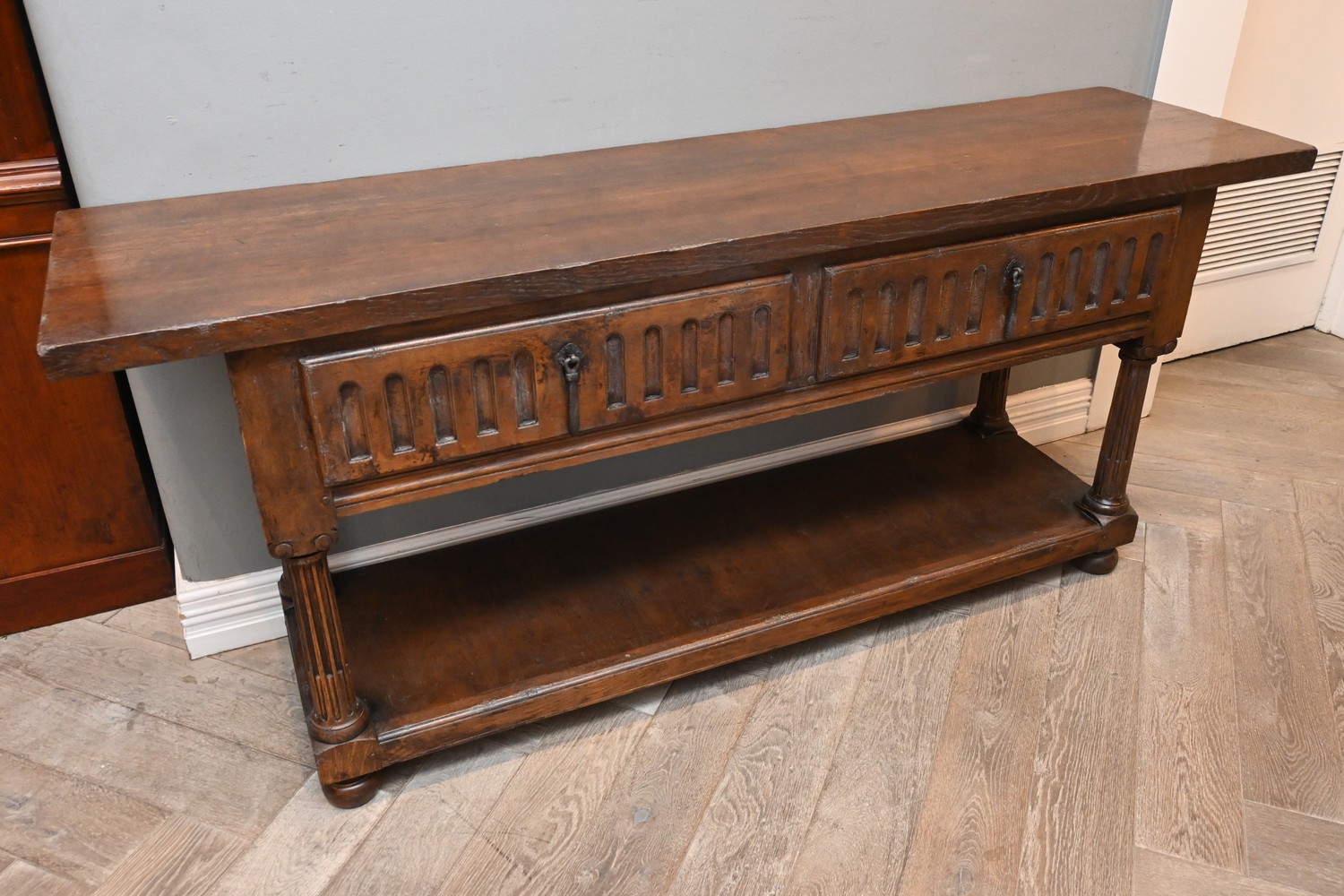 A SPANISH STYLE OAK TWO DRAWER HALL CONSOLE (83H X 191W X 50D CM) (PLEASE NOTE THIS HEAVY ITEM MUST BE REMOVED BY CLIENTS OR CARRIERS AT THE CUSTOMERS EXPENSE. LEONARD JOEL STAFF CANNOT ASSIST CARRYING THIS ITEM)