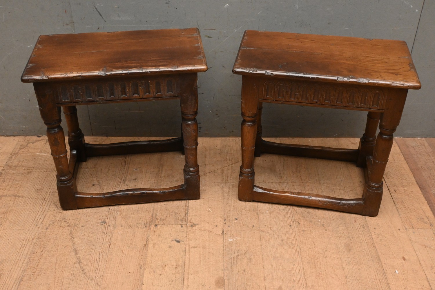 A PAIR OF 17TH CENTURY STYLE ENGLISH OAK JOINT STOOLS ( 46H X 49W X 29D CM)(LEONARD JOEL DELIVERY SIZE: LARGE)