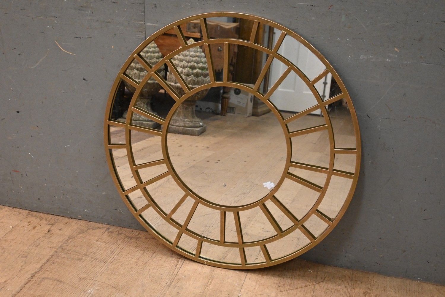 A CIRCULAR METAL GILT EFFECT MIRROR (81 CM D) (LEONARD JOEL DELIVERY SIZE: MEDIUM)